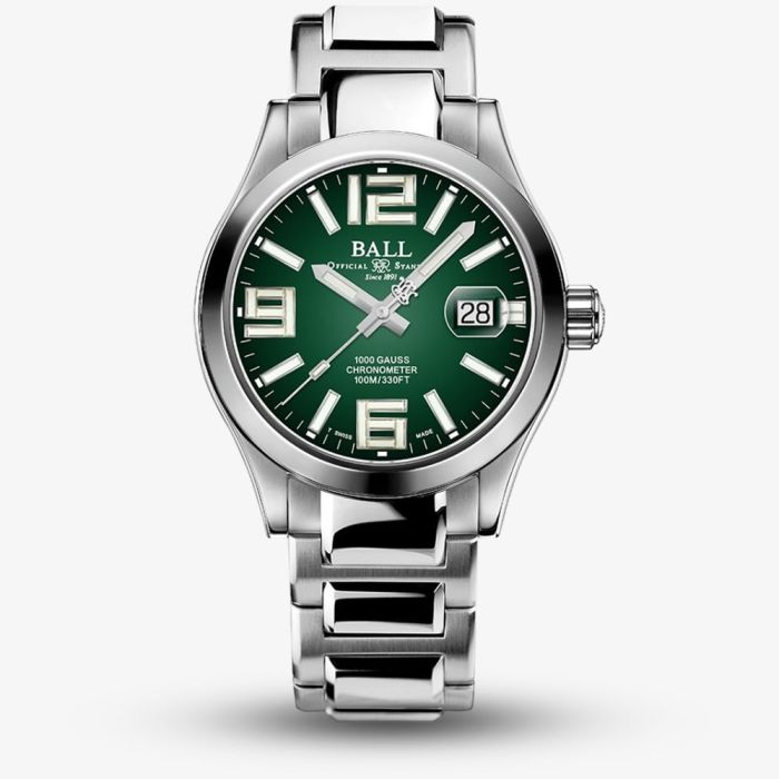 An elegant yet rugged timepiece that perfectly balances sophistication with durability. Its striking green dial, paired with a polished stainless steel case and bracelet, creates a bold statement of modern design and timeless craftsmanship. The vivid colour is enhanced by Ball's renowned micro gas tube technology, ensuring exceptional visibility in low-light conditions. Powered by an automatic movement with a power reserve of up to 42 hours, this watch delivers dependable performance for daily use. This watch also features impressive 100m water resistance. Ideal for those who appreciate a blend of luxury and resilience, this watch is a versatile accessory that stands out in any collection. • Powered by the chronometer certified automatic movement with 21 jewels and a power reserve of up to 42 hours. • Presented on a silver stainless steel bracelet with traditional buckle. • Scratch resistant sapphire crystal glass. • 40.0mm case width. • 100 metre water resistance.