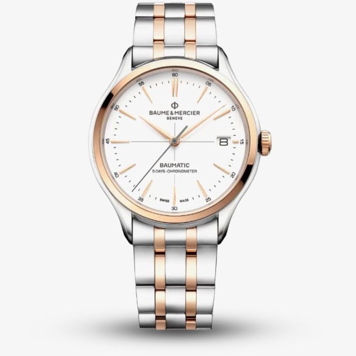 Please note this is an Ex-Display watch The Baume & Mercier BM0A10458 watch combines a 40mm round shaped stainless steel case and two colour stainless steel bracelet with a push button deployment clasp. It has a white analogue dial which is protected beneath sapphire crystal glass. Power is generated by the automatic movement. This model also has a water resistance of up to 50 metres.