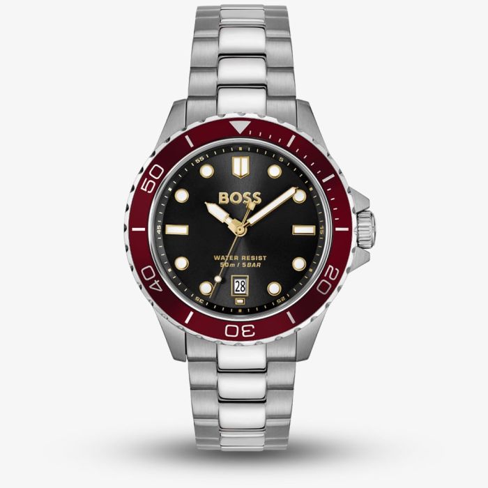 Bold and athletic, the BOSS Troper Sport is built for performance and presence. Featuring a stainless steel case and bracelet, this dynamic timepiece is highlighted by a striking red bezel and a contrasting black dial. Luminous hands and hour markers ensure visibility in any light, blending style with functionality. Designed for the modern man with an active lifestyle, this watch delivers confidence and precision. • Powered by the quartz movement. • Presented on a silver stainless steel bracelet with traditional buckle. • Mineral crystal glass. • 41mm case width. • 50 metre water resistance.