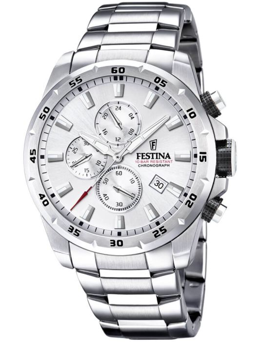 The Festina Mens Chrono Sport Watch F20463/1 combines a 45.05mm round shaped stainless steel case and a stainless steel bracelet with a push button deployment clasp. It has a silver tone chronograph display dial with a date window at four o-clock, which is protected beneath mineral crystal glass. Power is generated by the quartz movement. This model also has a water resistance of up to 100 metres.