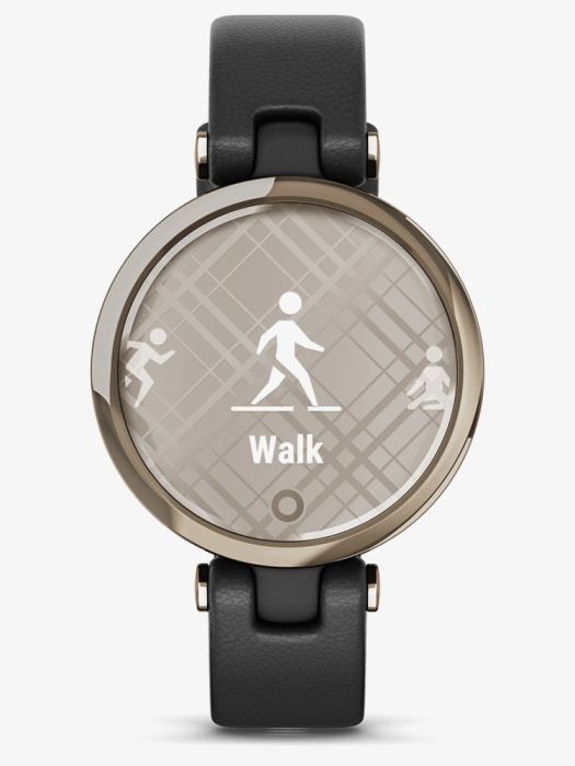 The Garmin Lily combines a 34.5mm fibre-reinforced polymer case and leather strap with a buckle clasp. It uses a TFT LCD touchscreen display measuring 25.4mm x 21.3mm with a display resolution of 240 x 201 pixels. It weighs 24 grams in total and has a stainless steel bezel with Corning Gorilla Glass 3. Its available gym activity profiles include: Strength, Cardio, Elliptical Training, Stair Stepping, Yoga, Pilates and Breathwork. Other tracking functions include: Body energy, stress, menstrual cycle & pregnancy, hydration, respiration, and blood oxygen. You can even respond to texts if you have an Android phone. • Powered by the quartz movement. • Presented on a black leather strap with traditional buckle. • Gorilla glass. • 35.0mm case width. • 50 metre water resistance.