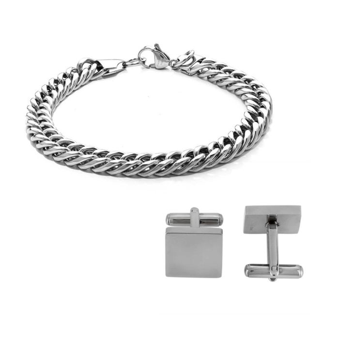 This stylish mens jewellery set is sure to bring a masculine edge to any outfit. Featuring a polished stainless steel bracelet, in an attractive twisted curb design, accompanied by a set of square cufflinks to complete the look.