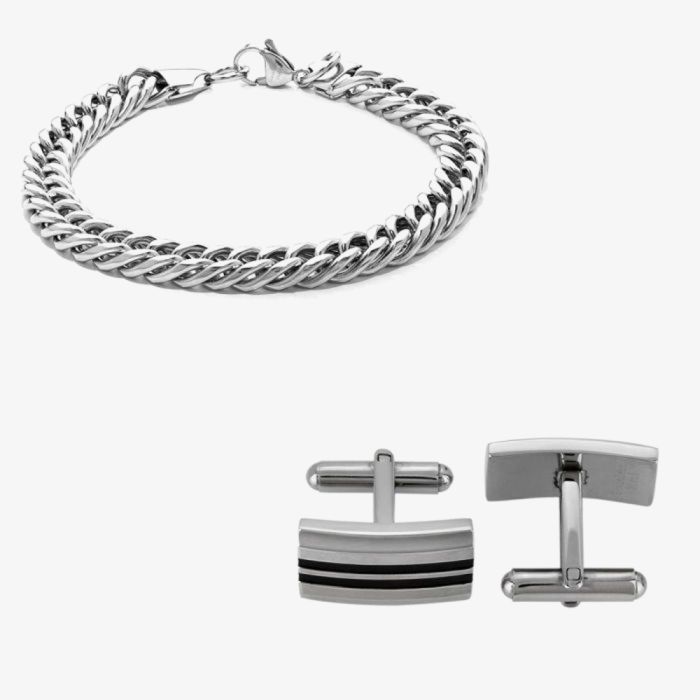 This stylish mens jewellery set is sure to bring a masculine edge to any outfit. Featuring a polished stainless steel bracelet, in an attractive twisted curb design, accompanied by a set of square cufflinks to complete the look.