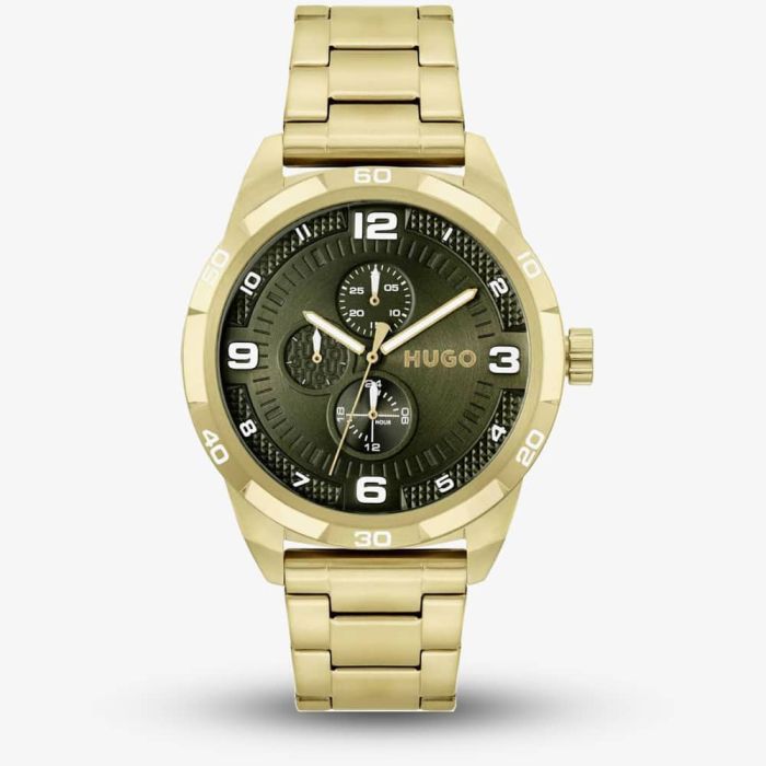 The HUGO 1530277 #Grip watch combines a 46mm round-shaped gold-plated stainless steel case and a gold-plated stainless steel bracelet with a push button deployment clasp. It has a dark green textured analogue dial with luminescent hands and three chronograph sub-dials protected beneath mineral crystal glass. Power is generated by the quartz movement. This model also has a water resistance of up to 50 metres.