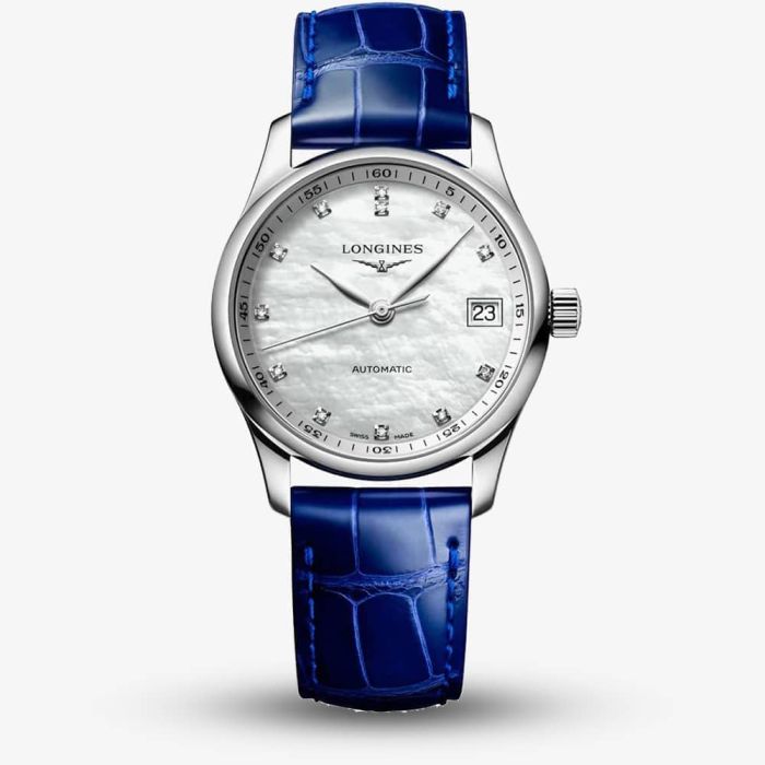 This elegant Longines Master timepiece features a shimmering mother-of-pearl dial adorned with 12 Top Wesselton VS-SI diamond hour markers, totalling 0.055 carats. Paired with a stylish blue alligator strap, it offers a refined blend of softness and sparkle. Self-winding mechanical movement beating at 25'200 vibrations per hour, with a power reserve up to 72 hours. • Powered by the automatic movement with a power reserve of up to 72 hours. • Presented on a leather bracelet strap with push button clasp. • Scratch resistant sapphire crystal glass. • 34mm case width. • 30 metre water resistance.