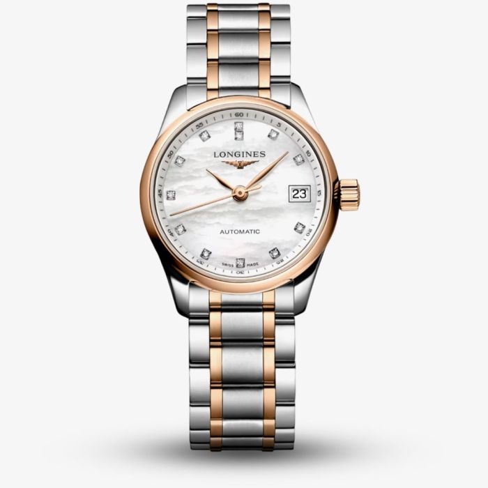 Part of the Longines Master Collection, this watch reflects the brand’s highest standards of craftsmanship and enduring elegance. The two-tone stainless steel bracelet with rose gold plating complements a lustrous mother-of-pearl dial, set with 12 Top Wesselton VS-SI diamonds totalling 0.034 carats—offering a refined blend of classic luxury and modern sophistication. • Powered by the automatic movement with a power reserve of up to 45 hours. • Presented on a stainless steel bracelet with push button deployment clasp. • Scratch resistant sapphire crystal glass. • 25.5mm case width. • 30 metre water resistance.