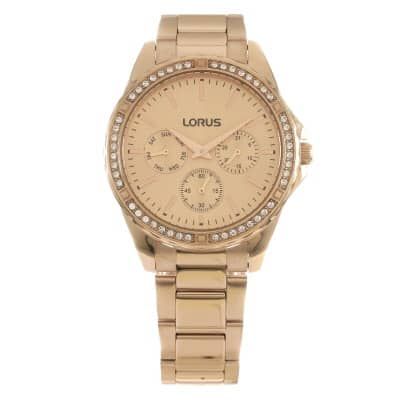 This stylish rose gold tone watch from Lorus is a great accessory to any modern outfit. Featuring a rose gold tone day/ date display, hands and hour markers, the dial is accentuated with a sparkling crystal set bezel. It is completed with a rose gold tone stainless steel bracelet and a push button deployment clasp.