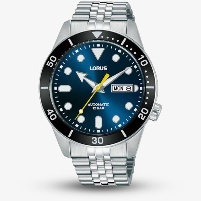 The Lorus RL449AX9 Sports watch combines a 42mm round shaped stainless steel case and 20mm wide jubilee bracelet with a push button clasp. It has a black bezel and dark sunray blue analogue dial with a day/date display, luminescent hour and minute hands, and a contrasting yellow seconds hand, all of which is protected beneath flat mineral crystal glass. Power is generated by the Calibre Y676 automatic movement. This model also has a transparent case back, a water resistance of up to 100 metres, and weighs 120 grams.