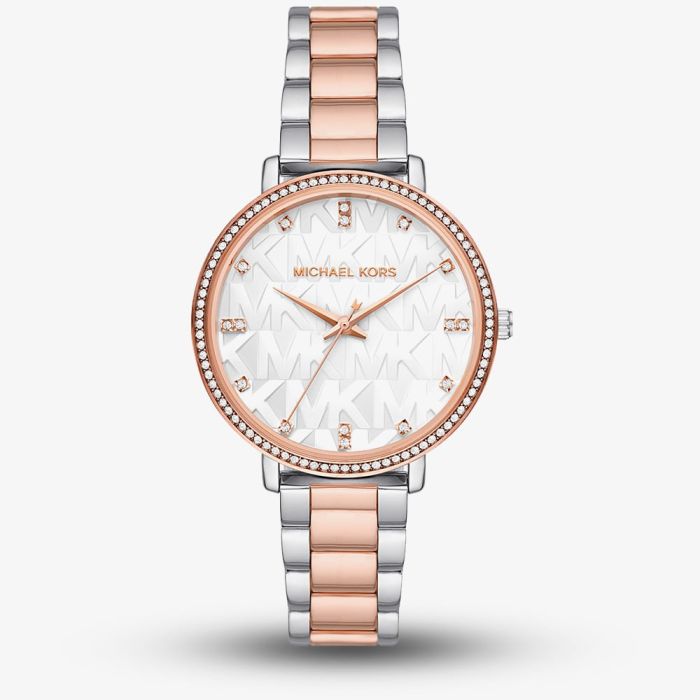 Radiating modern sophistication, the Michael Kors Pyper watch combines timeless design with a hint of sparkle. The two-tone silver and rose gold stainless steel bracelet beautifully complements the white dial, detailed with the signature MK logo and sparkling stone hour markers. A stone-set bezel adds a touch of luxury, making this elegant timepiece the perfect choice for elevating both everyday and evening looks. • Powered by the quartz movement. • Presented on a two colour stainless steel bracelet with fold over clasp. • Mineral crystal glass. • 38mm case width. • 50 metre water resistance.
