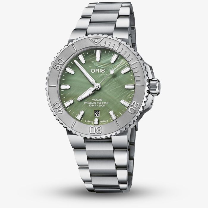 The limited edition Oris 01 733 7766 4187-Set watch combines a 41mm round shaped stainless steel case and silver stainless steel bracelet with a fold over clasp. It has a green analogue dial with date display which is protected beneath scratch resistant sapphire crystal glass. Power is generated by the automatic movement. This model also has a water resistance of up to 300 metres.