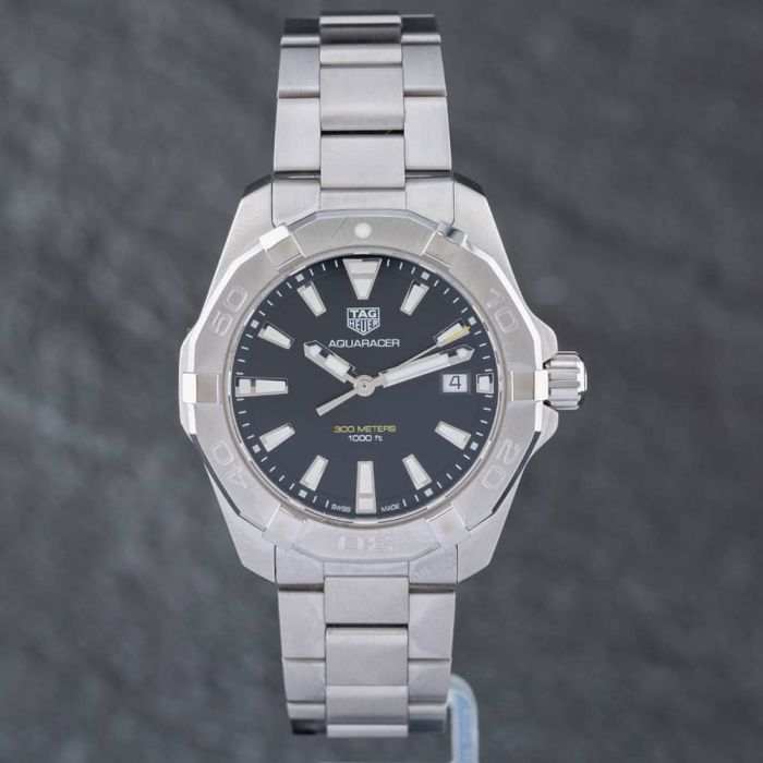 The TAG Heuer Aquaracer Watch combines a round shaped stainless steel case and silver stainless steel bracelet with a fold over clasp. The silver 41.0mm case measures 12.0mm thick and has a silver stainless steel uni-directional rotating bezel with a screwed in case back and a lug width of 20mm. The black analogue dial is protected beneath scratch resistant sapphire crystal glass and has baton hour markers, as well as luminescent hands, and a date display. Power is generated by the quartz movement. The watch weighs 171.2 grams and has a water resistance of up to 300 metres. The bezel has been changed from a black bezel to a stainless steel bezel. - Model Number WAY111A.BA0928 - Serial Number *****564 - Year of Manufacture 2017 This watch is supplied with its original box and paperwork. Click here to view our entire Men's Pre-Owned Watch collection Alternatively, to make enquiries or view items in person please call or visit your local T.H. Baker store. Click here to find your nearest store