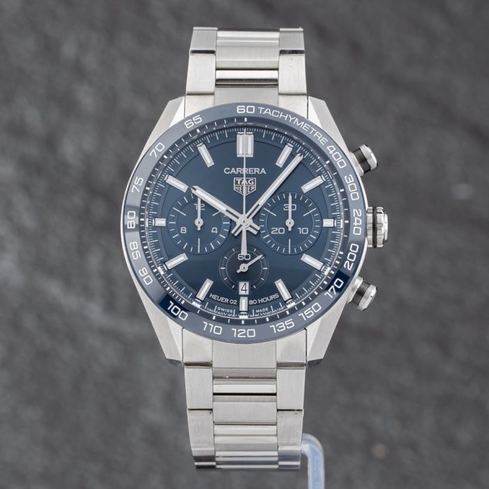 The TAG Heuer Carrera Watch combines a round shaped stainless steel case and silver stainless steel bracelet with a push button deployment clasp. The silver 44.0mm case measures 15.0mm thick and has a blue ceramic fixed bezel with a sapphire crystal case back and a lug width of 22mm. The blue analogue dial is protected beneath scratch resistant sapphire crystal glass and has baton hour markers, as well as luminescent hands, a date display, and chronograph function. Power is generated by the automatic movement with a power reserve of up to 80 hours. Other features on this watch include a tachymeter scale a tachymeter scale. The watch weighs 191.3 grams and has a water resistance of up to 100 metres. - Model Number CBN2A1A - Serial Number *****721 - Year of Manufacture 2025 This watch is supplied with its original box and paperwork. Click here to view our entire Men's Pre-Owned Watch collection Alternatively, to make enquiries or view items in person please call or visit your local T.H. Baker store. Click here to find your nearest store