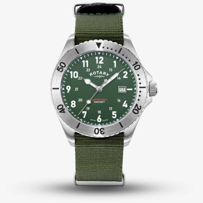 The Rotary GS05475/56 watch combines a 40mm round shaped stainless steel case and green fabric strap with a traditional buckle. It has a green analogue dial with luminescent hands, date display which is protected beneath scratch resistant sapphire crystal glass. Power is generated by the quartz movement. This model also has a water resistance of up to 100 metres.