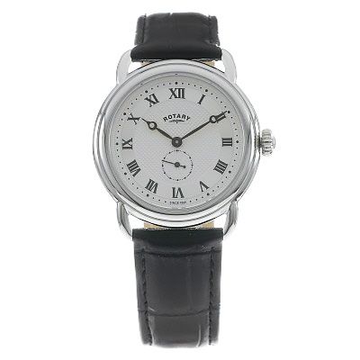 A vintage inspired timepiece from Rotary. The luxurious black leather strap with stainless steel case gives a suave finish accentuated by the round silver dial. Perfect for everyday wear. - Case Depth: 8mm - Case Width: 38mm - Water Resistance: 30m - Quartz Movement