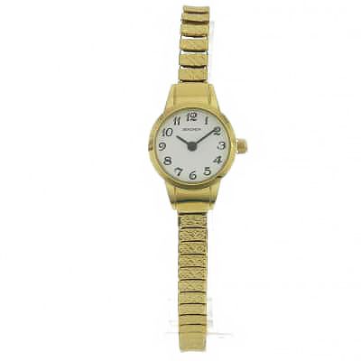 This elegant ladies gold tone watch features a slim design with an expandable bracelet for added comfort. This watch also has a simple white dial with bold black numeral markers. - Case Dimension: 20mm - Water Resistant: 30 metres - Movement: Quartz
