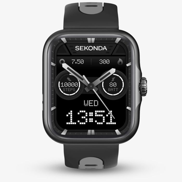 A powerful and stylish smartwatch designed to elevate your active lifestyle. With its sleek black design and comprehensive suite of features, this smartwatch is your ultimate companion for staying connected and achieving your fitness. A vibrant and responsive touchscreen allows for easy navigation and clear visibility. Monitor your steps, distance, calories burnt, heart rate, and sleep patterns with precision. Built-in GPS accurately tracks your outdoor activities, providing detailed data on your routes and performance. Receive instant notifications for calls, messages, emails, and app alerts directly on your wrist.   • Powered by the quartz movement. • Presented on a black plastic strap with traditional buckle. • Mineral crystal glass. • 39.0mm case width. • 10 metre water resistance.
