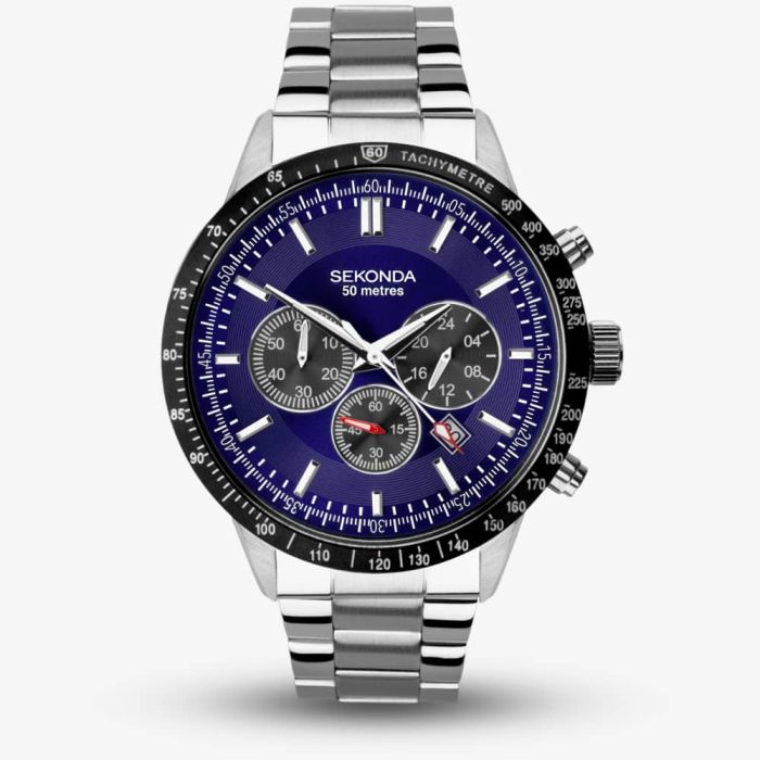 This watch has a blue analogue concentric ring pattern dial with two silver luminescent hands and a black second tracker. Black chronograph sub-dials and a tachymeter scale on the bezel. Whether you're dressed to impress at a formal affair or embracing casual refinement, this Sekonda watch effortlessly elevates your style with its understated yet refined design.