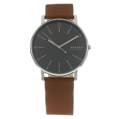 Skagen Mens Signatur Stainless Steel Dark Grey Dial Brown Leather Strap Watch SKW6578