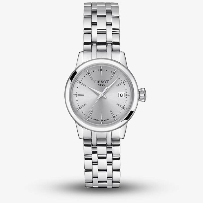 The Tissot Classic Dream Lady Silver Watch T129.210.11.031.00 combines a 28mm round-shaped stainless steel case and a silver stainless-steel bracelet with a push button deployment clasp. It has a silver sunray analogue dial with the date display visible at position three, protected beneath scratch-resistant sapphire crystal glass. Power is generated by the Swiss quartz movement with an end-of-life indicator. This model also has a water resistance of up to 50 metres.