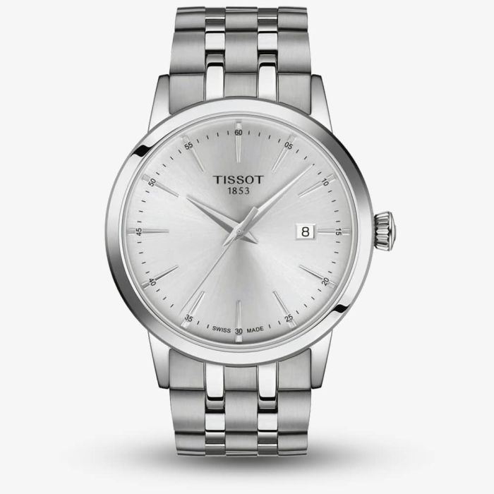 The Tissot Classic Dream Silver Two Tone Watch T129.410.11.031.00 combines a 42mm round-shaped stainless steel case and a silver stainless steel bracelet with a push button deployment clasp. It has a silver analogue dial with the date display visible at position three, protected beneath scratch-resistant sapphire crystal glass. Power is generated by the Swiss quartz movement with an end-of-life indicator. This model also has a water resistance of up to 50 metres.