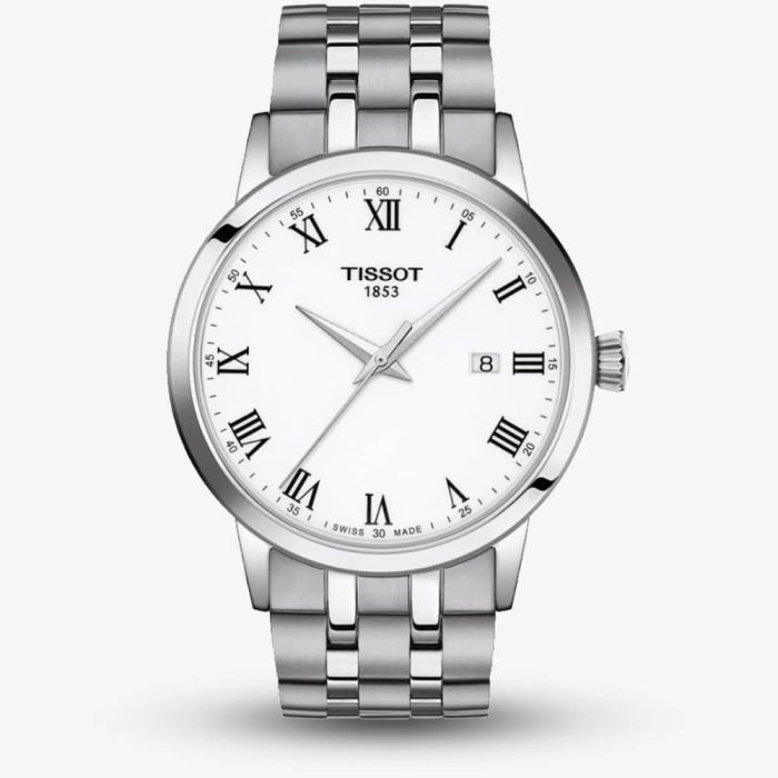 From Tissot's T-Classic collection, a sophisticated design crafted with a hard wearing stainless steel case and bracelet featuring a white dial with silver coloured hands and black roman numerals which are protected by a scratch resistant Sapphire Crystal glass. Additionally this model is powered by a Swiss quartz movement and features date display and is 50 metres water resistant.