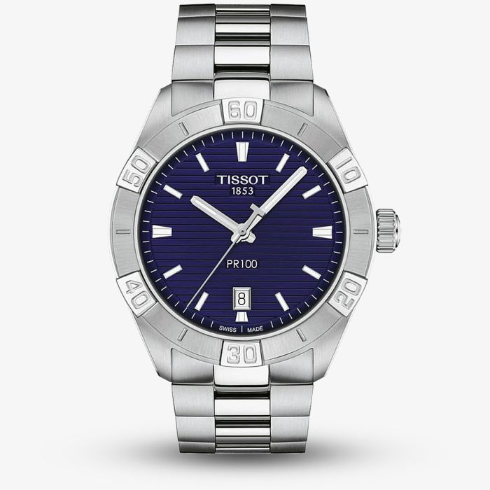 The Tissot T101.610.11.041.00 PR100 Sport watch from the T-Classic collection combines a stainless steel case and bracelet with a double push button clasp. It has luminescent hands and a date display which are protected beneath domed scratch resistant sapphire crystal glass. Powering the watch is a Swiss quartz movement with 3 jewels and an end of life indicator. This model also has a water resistance of up to 100 metres (330 ft/10 bar of pressure) and weighs 155 grams.